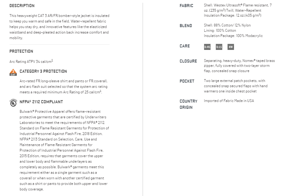 Certified by Underwriters Laboratories to meet the requirements of NFPA® 2112 Standard on Flame Resistant Garments for Protection of Industrial Personnel Against Flash Fire, 2012 Edition.